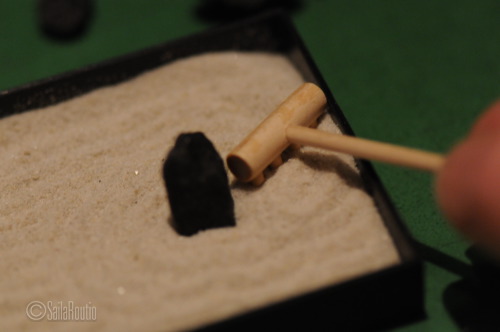 Ystävä toi matkatuliaisina pienen pelikorttiaskin kokoisen pahvilaatikon. Sisältä löytyi muovirasia, minikokoinen puuharava ja hiekkaa sekä kiviä pusseissa. Pienen pieni kirjanen opastaa zen-ajattelun maailmaan.